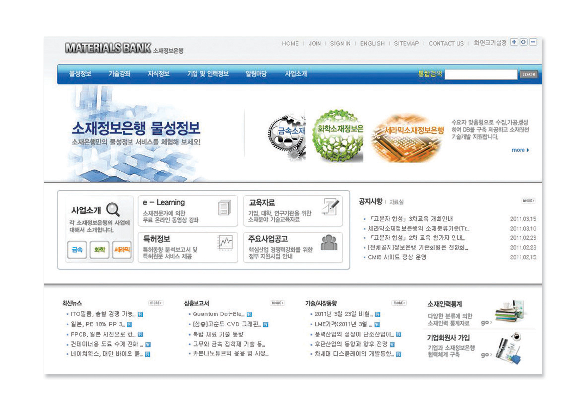 세라믹, 금속, 고분자 3개 소재정보은행이 통합사이트(www.matbank.org)를 개설 본격적인 서비스에 돌입했다. 지난해 국가예산만 1조원이 투입되는 WPM이라는 대한민국 소재산업의 지형을 뒤흔든 대형프로젝트를 추진하고 있는 지식경제부가 WPM 등 소재관련 R&D를 통해 생성되는 물성정보를 보다 효율적으로 자원화하기 위해 각각 독립적으로 운영되던 3개 소재정보은행을 한국산업기술진흥원(KIAT) 산하로 일원화했다. 소재정보은행은 기본적으로 국가정보자원으로서 소재정보(물성, 공정, 기술 등)를 수집·생성하고 가공하여 DB화 및 제공함으로 소재의 개발·사업화를 촉진시키는 유·무형의 인프라. 소재 개발 및 개발된 소재의 부품적용 시 필요한 핵심 물성정보를 제공하고, 실험 및 공정조건 변화에 따른 솔루션을 제공하고 있다.