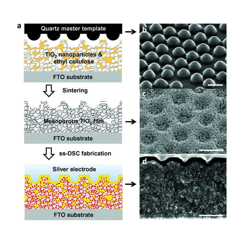 연구팀은 태양전지의 이산화티타늄 층에 나노돔(nanodome) 어레이를 갖춘 몰드를 가압함으로써 후면 반사층을 제작하였다. 결과적으로, 염료감응형 태양전지의 은 전극은 표면에 하니컴(honeycomb) 패턴을 갖게 된다. 이런 제작기법은 저렴하고, 확장 가능하며, 최종적인 나노패턴의 특성에 대한 조절이 용이해진다.