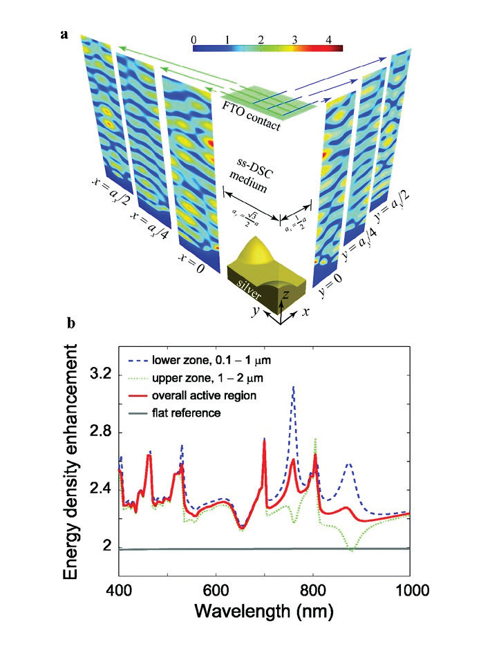 최근 발간된 연구에서, 미국 스탠포드대학, 스위스 로잔 연방공과대학교(Ecole Polytechnique Federale de Lausanne) 및 중국 과학원은 서로 다른 접근방법을 사용하여, 염료감응형 태양전지가 더 많은 빛을 흡수하도록 하기 위해 플라즈모닉 후면 반사층(plasmonic back reflector)의 개발에 초점을 맞추었다. 연구팀은 강력한 흡수능력이 있는 유기 염료로 만들어진 태양전지가, 패턴화된 후면반사층을 사용할 때 효율이 증가한다는 것을 보여주고 있다.