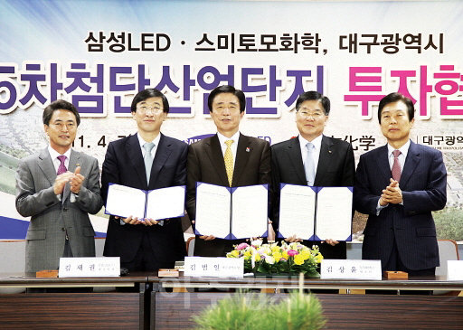 대구시는 지난달 7일 대구시청 상황실에서 삼성LED(대표이사 김재권)·스미토모화학(대표이사 토쿠라 마사카즈) 등과 대구 성서5차 첨단산업단지에 LED 핵심소재 공장 건립 투자협약을 맺었다. 이번 협약에 따라 양사 합작사는 산업단지 내의 11만719㎡의 부지에 오는 10월까지 사파이어 웨이퍼 합작공장을 완공하고 내년부터 본격적으로 가동한다.