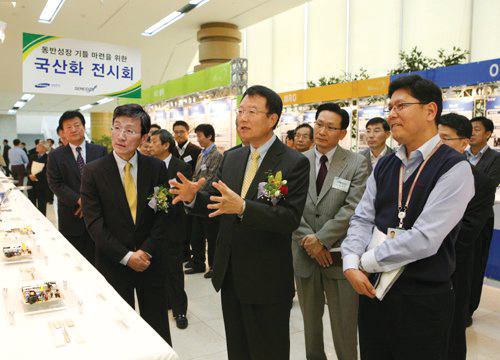 삼성전기는 수원사업장에서 박종우 사장과 100여개 협력회사 대표들이 참석한 가운데 ‘핵심부품 국산화전시회’를 개최했다고 지난달 1일 밝혔다. 이번 전시회는 삼성전기의 전자부품 생산에 필요한 원자재와 설비 가운데 핵심 품목 50개를 전시해 경쟁력 있는 국내 협력회사들이 국산화 과제에 적극 동참하도록 유도하려 마련한 자리다. 삼성전기는 국산화 과제에 참여하는 협력회사에는 기술·인력을 지원하고 노하우를 전수하며 정부의 국책사업과 연계할 수 있도록 지원할 예정이다