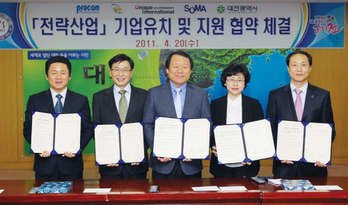 대전시는 지난달 20일 대전시청 중회의실에서 염홍철 대전시장을 비롯해 윤상현 ㈜프로컴시스템 대표, 유재섭 ㈜윌럭스 대표, 심태흥 유니크인터네셔널㈜ 대표, 이인경 ㈜소마 대표 등 관계자들이 참석한 가운데 대전이전을 위한 업무협약을 체결했다.