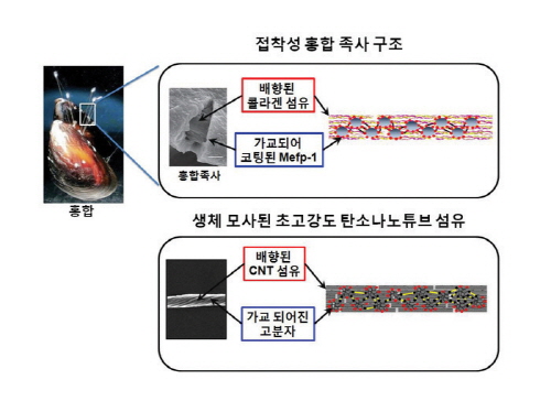 KAIST 연구팀은 이러한 난제를 자연계의 홍합 족사 구조에 착안해 해결했다. 연구팀은 고강도 탄소나노튜브 섬유가 콜라겐 섬유 역할을, 고분자 구조 접착제가 카테콜아민과 같은 역할을 하도록 했다. 그 결과 길이가 길고 가벼우면서도 끊어지지 않는 초경량 초고강도 탄소나노튜브 섬유를 개발했다.