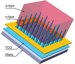 새로운 태양전지 구조는 n-형 나노콘으로 구성되어 있다. n-형 나노콘은 p-형 반도체에 의해 둘러싸여져있다. n-형 나노콘은 산화아연으로 구성되어 있으며, 접합부 프레임워크(framework) 및 전도체로써의 역할을 한다. p-형 반도체는 다결정 카드뮴 텔루리드(polycrystalline cadmium telluride)로 구성되어 있으며, 광흡수부 및 정공도체로써의 역할을 한다.