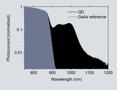 그림 2. 양자점 층은 적외선 내 크게 증가된 반응을 새로운 태양 전지에서 제공한다.