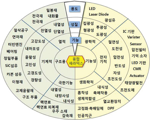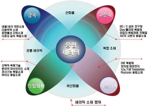융합세라믹소재는 산화물, 비산화물로 단순 구분되는 기존의 세라믹소재의 범위를 넓혀 금속, 고분자, 정밀화학 분야의 기술이 접목된 복합소재로서, 구성단위로는 원자부터 벌크 크기까지, 기능적으로는 복합기능, 경사기능, 극한기능 등의 첨단복합기능을 포함하고, 산업적으로는 고부가가치를 가지는 소재를 의미한다. 그림 2에 기존 소재산업과 융합세라믹소재와의 연계성에 대한 모식도를 나타내었다.