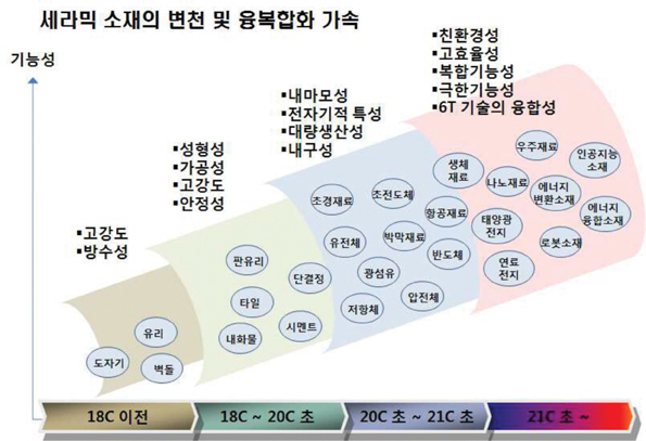 <그림 4. 시대에 따른 세라믹소재의 변천과정과 융복합화 경향>