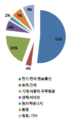 첨단세라믹 시장규모는 ‘07년 약 13조원으로 주로 이동통신, 디스플레이 등 전기전자부품·소재의 비중이 높으며 최근 신재생에너지, 환경, 바이오, 우주항공 등 새로운 영역이 개척됨으로 인하여 시장이 년 25%이상의 급격한 팽창이 예상된다.“파인세라믹 산업실태 및 발전전략”, 지식경제부 2008). 수요처별 세라믹 업체 분포를 보면 전기·전자 세라믹스 부품·소재를 생산하는 전기·전자·정보통신 분야가 50%를 상회하고 있고 구조 세라믹스를 생산하는 업체가 21% 정도로서 대부분 전방산업인 전기/전자/이동통신 산업이나 자동차/기계산업의 지원 체제로 구성되어 있다. 그림 5는 수요처 별 세라믹 업체의 분포를 나타낸 것이다.