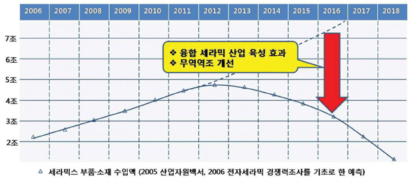 특히, 세라믹 제품은 2009년 현재에도 일본이 부품소재의 강국으로 자리매김을 하는데 결정적인 역할을 하고 있고, 대일 무역 역조 비중이 큰 부문인 만큼 세라믹산업이 연관 전방산업에 미치는 영향은 매우 지대하다. 현재 일본에 크게 뒤쳐져 있는 첨단세라믹산업을 비롯한 부품소재산업은 융합이라는 패러다임에서는 미국이나 일본 등 선진국들도 새로운 출발선에서 시작하는 것이므로 충분히 부품·소재 강국으로 발돋음할 수 있고, 본 사업은 그 토대중의 하나가 될 것이 분명하다. 아래의 그림 7은 이러한 융합세라믹산업의 육성에 따른 효과를 도식화하여 나타낸 것으로 고용유발, 생산유발은 물론 신규 기업 창출효과를 얻을 수 있을 뿐만 아니라 세라믹 부품소재 무역역조 개선효과로 2018년 이후 5조 이상이 기대되고 있음을 알 수 있다.
