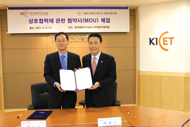 한국세라믹기술원(원장 김경회)과 서울디지털산업단지 경영자협의회(회장 이영재)가 지난 5월 25일 한국세라믹기술원에서 서울디지털산업단지 내 기업 발전을 위한 지원 및 협력을 추진하는 내용을 골자로 한 업무협약서(MOU)를 체결했다.