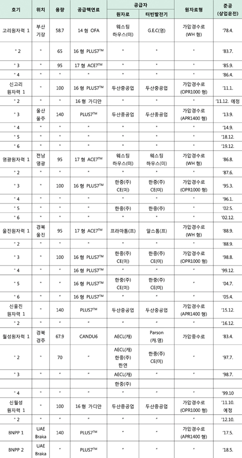 표 1에서 보듯이 2011년 현재 국내에서는 총 21기의 발전용 원자로가 상업 가동되고 있으며 이 중 17기의 가압경수로(PWR: Pressurized Water Reactor) 및 4기의 가압 중수로(PHWR: Pressurized Heavy Water Reactor)으로 구성되어 있으며, 향후 11기의 추가 경수로형 원전이 건설 예정이다.