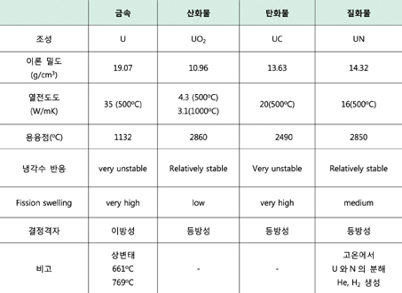 원자력 발전소의 열효율을 증가시키려면 발전소 운전온도를 가능한 한 높게 올려주어야 하는데 금속연료의 경우 융점이 낮고 이방성이 커서 고온에서 불안정하여 일부 연구로를 제외하고 실제 상용원전에서는 금속형태의 연료를 사용할 수 없다. 이와 같은 점 때문에 많은 종류의 세라믹 형태 연료가 연구되고 현재 상용원전에서 사용되고 있는 대부분의 핵연료는 금속이 아닌 세라믹 형태를 사용하고 있다. 세라믹 연료의 장점으로는 용융점이 높아 연료 및 발전소의 운전온도를 높게 올릴 수 있어 열효율을 증가시킬 수 있으며 저온 상변태가 없어 칫수, 구조 및 체적에 대한 조사안정성이 좋고 원자로에서 비교적 화학적 반응없이 피복관(핵연료소결체를 둘러싸고 있는 Zr합금 튜브) 및 냉각재와의 양립성이 좋아 산화 및 냉각재에 대한 내식성이 높다. 현재 90% 이상의 상용원전에서 사용하고 있는 세라믹 형태는 산화물이나 다른 형태의 세라믹 연료에 대한 연구도 상당 수준 진행되어 있다(표 2참조). 이 중 우라늄 산화물과 플루토늄 산화물 형태의 연료가 가장 많이 사용하고 있으며 본 고에는 현재 국내 원전에 사용되고 있는 우라늄 산화물에 대한 주요 특성들을 서술하였다.