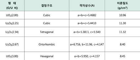 우라늄 산화물은 표 3에 나타난 것과 같이 O/U 비에 따라 크게 5가지 형태가 있는데 상업용으로 사용하고 있는 것은 UO2로 경수로 및 중수로 발전소의 핵연료로 사용되고 있다. 이산화 우라늄은 흑갈색을 띄고 있으며 용융점은 2865℃, 밀도가 10.96g/㎤이다. 이산화 우라늄은 fluorite(CaF2형) 결정구조를 가지며 고온에서는 결정격자 내에 잉여산소를 수용할 수 있는데 이러한 잉여산소는 핵연료 성능에 중요한 영향을 미치는 것으로 알려져 있다. 이산화 우라늄에서 산소와 우라늄의 비율을 O/U비라고 하는데 이 비가 정수가 되었을 때를 화학양론(stoichiometry) 상태라 하고 이 비율에서 벗어나면 많이 달라진다. 일반적으로 화학양론비에서 벗어날수록 크립, 소결 및 확산속도에 미치는 영향이 큰 것으로 알려져 있다.