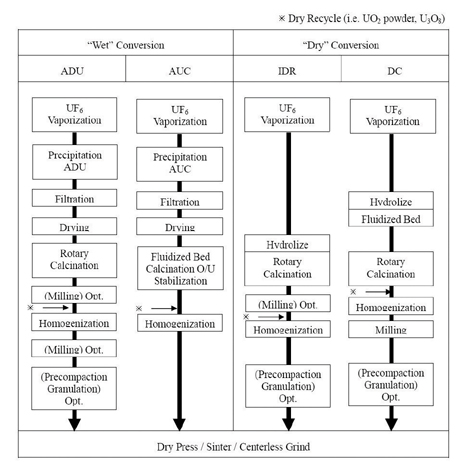 UO2 소결체 제조공정은 일반 세라믹 재료 제조방법과 유사하여 분말혼합공정, 압분공정, 소결공정 및 연삭공정으로 이루어지는데 재변환 공법에 따라 제조된 분말의 특성이 달라 소결체 제조공정이 부분적으로 차이가 난다. 가장 크게 차이가 나는 것은 분말처리 공정으로 ADU 와 DC 공법으로 제조된 분말은 상대적으로 크기가 작고 유동성이 양산공정에 적용하기 충분하지 않기 때문에 AUC 공법으로 제조된 분말과 달리 소결체 제조공정에 예비 압분공정, 조립화(granulation), 구형화(spherization) 및 윤활화(lubrication) 과정을 거치는 분말 전처리 공정이 추가된다.