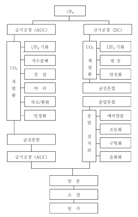 ted Dry Route)과 DC(Dry Conversion) 방법 등이 있으나 공정자체에 큰 차이는 없다. 현재 국내에서는 경수로용으로 액체폐기물의 처리문제를 경감하고자 AUC 공법에 의한 분말 생산을 중단하고, 1998년부터 DC 공법으로 제조한 우라늄 분말을 생산하고 있으며, 또한 중수로 발전소용으로 ADU UO2 분말을 수입해 사용하고 있다. 재변환 방식이 다른 UO2 분말은 그 특성이 다르기 때문에 규정하고 있는 특성항목도 다르며 각기 다른 기술시방서를 적용하고 있다. DC 공법인 모든 반응이 기체상태에서 이루어지므로 반응제어가 어려운 단점이 있다. 웨스팅하우스사(미국)는 ADU 공법을 사용하여 분말을 제조하고 있고 영국의 BNFL사 및 독일 AREVA사는 건식방법을 채택하고 있다.