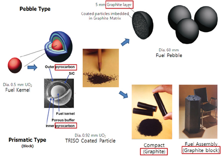 이를 위한 고온가스로 핵연료로는 그림 8에 나타낸 바와 같은 흑연 기지 내에 SiC와 PyC이 코팅된 TRISO UO2 피복입자들이 분산된 구형 pebble로 구성된 pebble bed 형이거나 코팅된 UO2 입자들이 rod나 compact에 내장되어 적층된 핵연료 pin으로 구성된 prismatic block 형이 이용되고 있다.