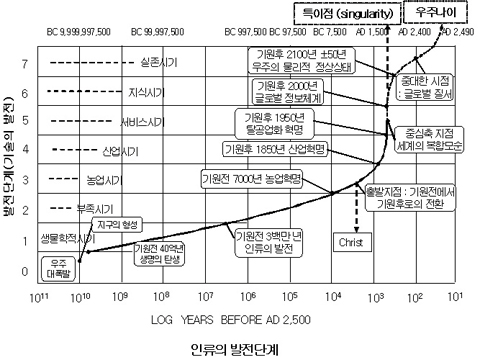 그림 1에서 특이점(singularity)으로 불리는 시기는 이미 AD가 시작되는 AD 1년을 지나면서부터 인문학이 발달하고 인류의 모든 영역에 촉진작용을 일으켜 르네상스와 종교개혁과 과학혁명을 일으키면서 급격하게 우리에게 다가오고 있다고 말할 수 있을 것이다.