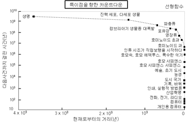 이 그림은 x 축에 로그 배율 대신 선형 배율을 적용한 것이다. 이 그림에는 가속이 매우 극적으로 나타나지만, 세부 항목들의 시간 구분이 거의 보이지 않는다. 선형 관점에서 보면 대부분의 주요 사건이 ‘최근’에 급격하게 발생하였다. (커즈와일의 “특이점이 온다”에서 인용)
