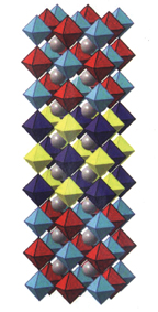 [그림 1] Double-Perovskite 결정구조 모식도 - Double-Perovskite 결정에서 가운데 즉, 4개의 팔면체 블록 내부에 있는 원자는 2가지 종류로 이루어져 있으며 각각의 원자는 인접한 ‘블록 내부 공간’에 위치한다. OSU의 연구팀이 사용한 Double-Perovskite물질은 Sr2FeMoO6로 팔면체 블록 내부에 위치하는 원자는 Fe와 Mo 이며 이 두 원자는 Sr2FeMoO6에 자성을 부여하는 역할을 한다. Double-Perovskite구조인 Sr2FeMoO6는 고유의 자성특성을 이용하여 압력, 온도, 자기장, 전압 등을 측정하는 센서로도 활용될 수 있다고 한다. “Perovskite 결정 구조는 팔면체 블록 4개가 만들어 낸 공간상에 위치하는 상이한 크기를 지닌 두 개의 원자에 의해 독특한 전기적, 자기적 특성을 가지는데 이 두 개 원자들의 종류를 바꾸는 방법으로 물질의 특성을 조절 할 수 있다.