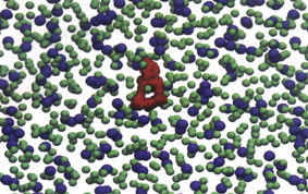 [그림 3] 절대온도 0K 부근의 초저온에서 유리를 구성하는 원자들의 거동에 대한 시뮬레이션 정지 이미지 - 붉은색 링처럼 보이는 부분은 유리를 구성하는 원자가 유동할 수 있는 공간이다.