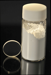 [그림 6] 투명 레이저(왼쪽)과 그것을 제작하는데 사용되는 나노분말을 포함한 유리병.