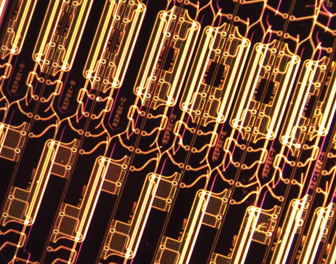 [그림 8] 광학 및 레이저 부품을 만들기 위한 웨이퍼. 칩은 레이저에서 나오는 신호를 조작하기 위한 변조기를 포함하고 있다. 현재 기술은 훨씬 더 작은 크기에서 광학적 빔의 방향을 조절하기 위한 실리콘 나노기둥을 사용한 이론으로부터 혜택을 받을 수 있을 것이다. 각 변조기는 길이가 7 밀리미터로써 실리콘 나노기둥의 크기보다 훨씬 크다.