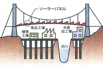 竹村위원이 소개한 현수교식 메가솔라 발전은 太田俊昭 九州대학 명예교수 등이 제안한 시스템. 태양광 발전 판넬을 부설한 현수교를 피해지 상공에 배치하고, 그 아래에 기계부품 등의 공장이나 수산가공 공장, 야채 등을 기를 수 있는 식물공장 등을 두자는 구상이다. 공장은 강관(鋼管)을 지면에 꽂은 위에 인공 지반을 만들고 공장 등을 배치한다. 강관은 인공 지반을 지지하는 말뚝으로서뿐 아니라 주간의 잉여전력으로 압축한 공기를 저장하는 역할도 담당한다. 압축 공기는 야간에 발전기를 움직이는 에너지원 등으로 쓰인다.