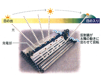 아울러 태양에너지를 가동형 반사경으로 효율적으로 모을 수 있는 구조도 도입했다. 태양의 움직임에 맞추어 반사경이 움직여 발전부에 빛이 항상 닿는다. 이러한 연구로 설치 면적 당 발전량은 실리콘 기판을 사용하는 태양광 판넬의 약 2배, 세계 최고 수준이 된다고 한다.