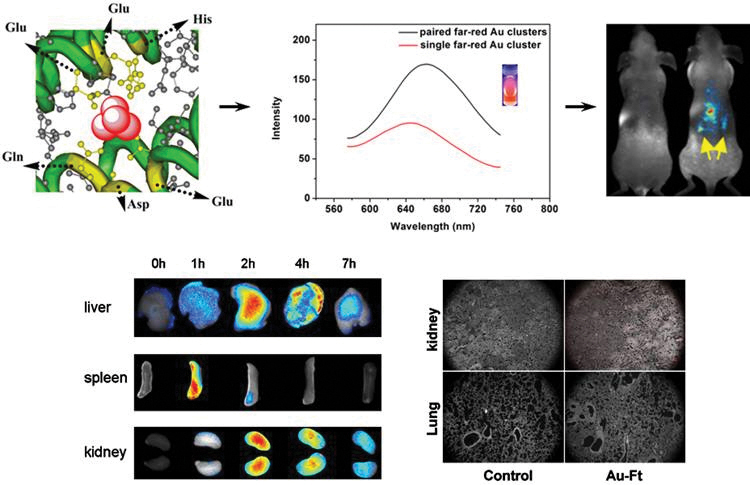 이어서, 연구팀은 천연적인 페리틴(ferritin)을 나노반응기로 하여 “제어포인트”(points of control)전략을 응용하여 ferritin의 heavy chain의 철산화효소활성부위를 조절하여 각종 쌍을 이룬 나노 Au cluster(Au-Ft)를 합성했다. 단일cluster과 비해볼 때, 합성한 Au-Ft복합물은 귀금속금이 고유하고 있는 photo-luminescence특성을 보존하였을 뿐만 아니라 변화가 가능한 형광발사 스펙트럼, 형광성이 현저히 증가한 특성, 및 대량의 발사파장의 redshift 등의 변화를 나타냄으로써 Au cluster간의 상호작용효과가 존재한다는 것을 직접적으로 증명했다.