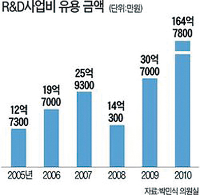 예컨대 한양대학교는 30억원 규모의 ‘부품소재 신뢰성 전문인력 양성사업’을 하면서 6억3000여만원어치의 재료와 부품을 다른 목적으로 사용했다가 적발됐다. 또 이노비전과 유니드일렉트로는 신기술의 피코프로젝터를 공동 개발하면서 지원받은 사업비 31억5000만원 중 8억8000여만원을 무단으로 인출해 환수조치 당했다.