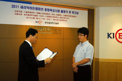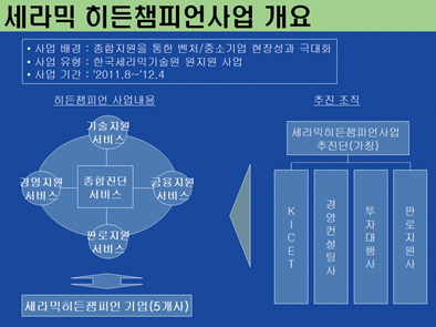 한국세라믹기술원은 지난달 7일 기술원내 강당에서 ‘세라믹 히든챔피언 종합육성사업’ 발대식 및 워크샵을 개최했다. 이 사업은 한국세라믹기술원 및 외부 전문기관이 공동으로 팀을 구축한 후 세라믹 중소기업에게 기술뿐만 아니라 금융, 판로, 경영 등 종합지원서비스를 제공하는 사업으로서 올해에는 5개 중소벤처기업이 선정됐다. 이 사업은 내년 4월말까지 진행될 예정이다.