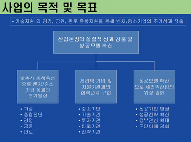 이들 기업에 종합육성서비스를 제공할 지원기관은 한국세라믹기술원(기술지원, 사업운영), 와이즈포스트(경영지원), 리앤어드바이저스(금융지원), EC21(판로지원)이다.