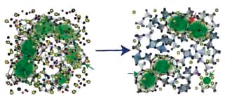 [그림] 고온에서 용융된 12CaO-7Al2O3와 C12A7유리의 결정배열과 결정배열 내부에 용매화되어 존재하는 전자의 모식도