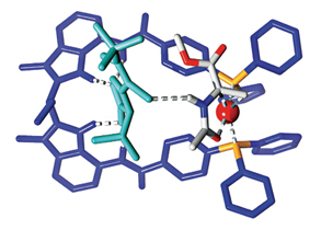 자연과 전이금속 촉매과정에서 영감을 얻은 암스테르담대(Uni-versity of Amsterdam)의 Joost N. H. Reek과 동료 연구자들은 아미도인돌릴(amidoindolyl) 기반의 구조에 의해 디페닐포스파인(diphenylphosphine)의 쌍으로 이루어진 아키랄리간드로 실험을 시작했다. 이 초분자이간드가 로듐(rhodium)에 결합하게 되면, 이들은 금속 옆에 결합 포켓을 만든다.