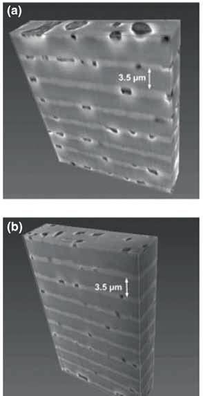[그림] 3차원으로 나타낸 MLCC의 미세구조 (a)낮은 승온속도로 Firing된 MLCC (b) Fast Firing에 의해 제작된 MLCC