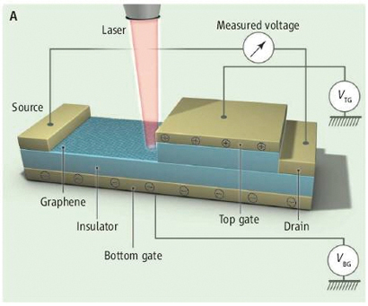 [그림 1] 광열전 효과를 입증한 그래핀 기반 소자의 모식도. 절연체 기판 위에 올려진 그래핀은 양쪽에 두 전극과 닿아 있고, 전체적으로 아래쪽에는 하부 전극, 그리고 절반의 영역에 대해서 상부 전극을 포함하는 구조이다. 왼쪽 영역은 하부 전극에 의해, 오른쪽 영역은 상부/하부 전극에 의해 전자 밀도를 제어할 수 있다. 빛이 조사됨에 따라 소스와 드레인 전극 사이에서 전압차를 측정할 수 있다.