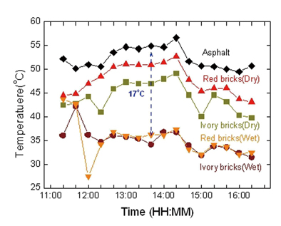 보차도용 열섬현상 저감 보습 점토벽돌 및 그 제조방법