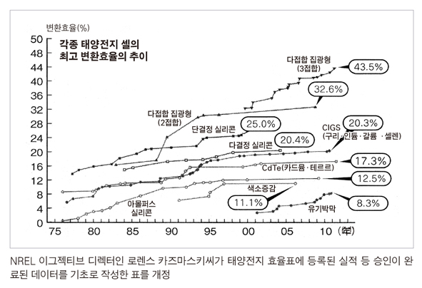 「『단결정 실리콘』은 1999년에 기록한 25%에서 그쳤습니다. 실리콘형의 이론 한계는 30%에서 상한에 가깝지요. 『다결정 실리콘』도 2004년에 20%를 기록한 뒤 갱신되지 않았습니다. 다결정은 단결정에 비해 불완전한 결정이므로 깎아서 생각해 보면 역시 상한에 가깝습니다. 이론한계에 가깝고 기록갱신이 없는 형은 변환효율을 상한에 가깝게 하기보다는 실용 면에서의 연구가 활발하다고 할 수 있겠지요. (태양전지 효율표에 기초) 이 그래프는 실험 수준의 기록으로 실용화연구의 성과는 나타나 있지 않습니다.」