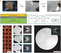 연구진은 먼저 통상적인 고온 화학기상증착법을 통해 구리 기판 위에 대면적의 그래핀을 합성하고, 새로운 기판 (유리, 고분자 박막, 그리고 산화 실리콘 웨이퍼)에 전사했다. 합성된 그래핀은 투과전자현미경 및 라만 스펙트럼 측정을 통해 고품질의 단일층 그래핀임을 확인했다. 그리고 액정 물질인 5CB(4-pentyl-4′-cyanobiphenyl)를 코팅했다. 5CB는 23도에 이르면 결정질에서 액정 상태로, 그리고 35도에서는 등방성 상태로 상변이를 일으키는 네마틱 물질로써, 그래핀 위에 균일하게 코팅이 가능하다.
