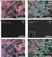 [그림 3] (a) 그래핀 위에 정렬된 액정 분자. (b) 40도 이상에서 액정 분자는 등방성 분자로 전이되고, 투과도가 매우 낮아진다. (c) 냉각과 함께 액정 분자는 재정렬되고, 초기 상태와 동일한 이미지를 나타낸다. (d,e,f) 전계장이 인가되기 전, 후, 그리고 다시 원상태로 돌아온 경우에 대한 이미지.