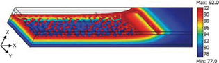 [그림] quench하는 동안 YBCO 선재에서 3차원 온도분포의 스냅샷은 매우 부분적으로 매우 높은 온도 구배를 보여준다. North Carolina 주립대에서 개발한 다규모 모델링 접근 방식은 초전도 기하학과 특성을 최적화하는 데 도움이된다.