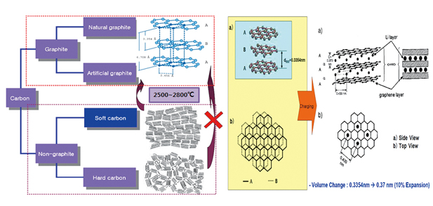 음극용 탄소재는 <그림 1>에 나타낸 바와 같이 흑연계와 비흑연계로, 흑연은 천연흑연과 인조흑연으로, 비흑연계는 소프트탄소계와 하드탄소계로 구분한다.