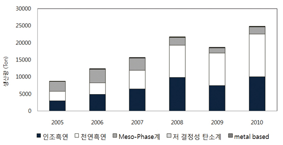 음극소재별로 보면 2010년에 음극의 89% 정도(천연흑연 62%, 인조흑연 27%) mesophase계가 9%, 저결정성 탄소계와 metal base계 3% 정도가 사용되고 있다.