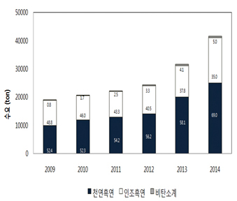 재료별 수요전망을 보면 <그림 3>에서처럼 천연흑연과 비탄소계의 수요는 계속적으로 증가하고 인조흑연은 감소하여 2009년에 천연흑연과 비탄소계가 각각 50, 4%였던 것이 2014년에 60%(25,872t)와 5%(2,156t)로 증가한 반면 인조흑연은 2009년에 48.8%였던 것이 2014년에는 35%(15,092t) 정도로 감소할 것으로 전망된다. 이는 가격의 저가화에 기인하는 것으로 판단되는데 향후 전지 단가가 낮은 천연흑연이 가격측면에서 유리하기 때문에 새로운 저가, 고용량, 고출력 음극소재가 저가로 개발되지 않는 한 천연흑연의 사용은 계속적으로 증가하게 될 것이다.