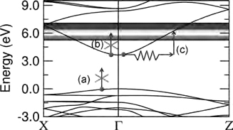 <그림> rutile 구조의 SnO2의 밴드구조, free-carrier의 흡수 설명. (a) 가시광선은 밴드갭을 넘어설 수 있을 정도의 에너지를 carrier에게 제공하지 못 한다, (b) free-carrier는 다음 전도대 영역으로 직접 여기되지 못한다. (c) 그러나 phonon이 제공하는 momentum을 통하여 가시광선이나 적외선 파장 영역에서 간접적으로 free-carrier의 흡수가 가능해진다. 가시광선 영역의 에너지 레벨이 명시되어있다.