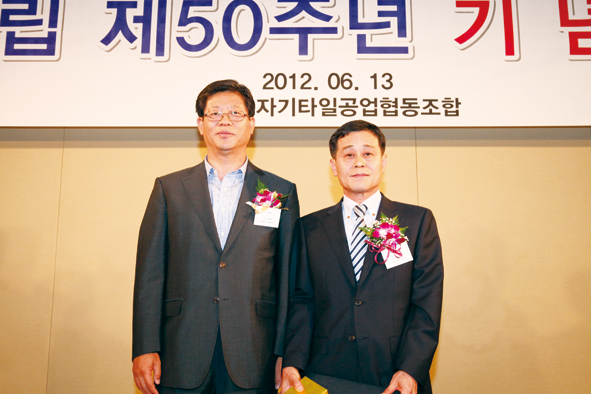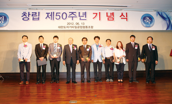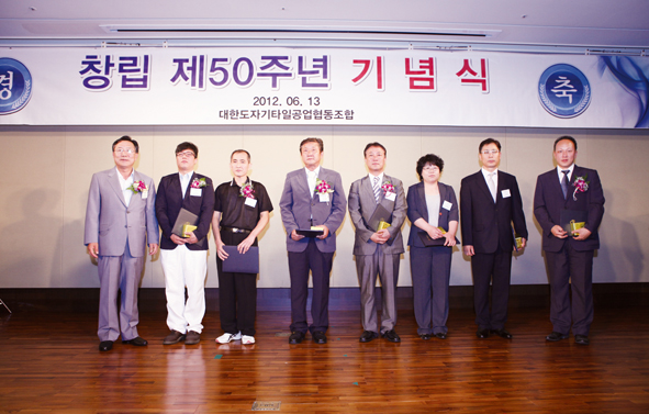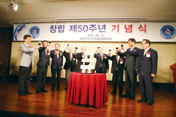 대한도자기·타일공업협동조합(이사장 문주남)은 지난 6월 13일 63빌딩 주니퍼룸에서 산·학·연 및 외빈 등 200여명이 참석한 가운데 ‘창립 50주년 기념행사’를 개최했다. 주요 참석자로는 한국세라믹총협회 남기동 명예회장, 지식경제부 김재홍 실장, 중소기업중앙회 김기문 회장, 前과기처 김기형 장관, 한국세라믹기술원 김민 원장, 한국세라믹학회 허종 부회장, 도자기타일공업협동조합 18-20대 황호연 이사장 등이 참석했다.