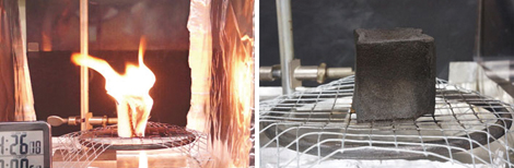 그림1> NIST 연구팀은 콘 칼로리미터(cone calorimeter)라고 불리는 시험 장치를 이용하여 화염 발열 속도(HRR; heat-release rate)와 다른 재료의 가연 특성을 측정했다. 상부 그림은 열원 근처로부터 화재를 포획하는 처리되지 않은 폴리우레탄 폼이며, 하부 그림은 새로운 점토로 채워진 코팅으로 처리된 폴리우레탄 폼이 동일한 열원에 노출됐을 때 점화되지 않는 모습을 보여주고 있다.