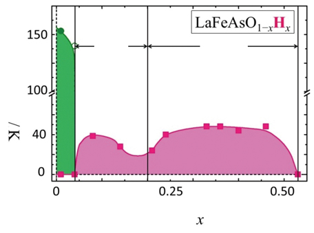 LaFeAsO1-XFX는 철계초전도체로서 최초로 발견된 물질계로 x가 0.04~0.20까지의 범위에서 초전도가 발현되고 있었다. 불소 이온(F-) 대신에 수소 음이온(H-)을 이용하면, x=0.04~0.53가 되어 지금까지보다2배 이상의 전자를 도핑할 수 있다는 것을 찾아냈다. 이렇게 제작된 시료에 대해 초전도를 조사해 보면, 초전도 특성은0.04~0.20(영역I)뿐만 아니라, 0.20~0.53(영역II)의 범위에서도 출현, 오히려 후자가 더 높은 Tc를 나타내고, Tc가 x에 그리 크게 의존하지 않는다는 결과를 얻을 수 있었다.