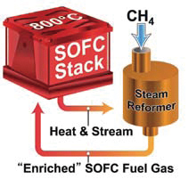 메탄(Methane)은 연료원으로 이용되고 연구팀에 의해 설계된 외부 증기형성 과정을 통하여 수소나 일산화탄소로 전환되기도 하였다. 증기 재형성 과정을 유도하기 위한 열은 SOFC의 배출을 통하여 충분히 얻을 수 있는데 마이크로채널의 열 교환을 통하여 이루어진다. 클립보다 얇은 마이크로채널을 이용함으로써 열 교환 표면적은 최대화되고 증기 재형성 과정을 보다 효과적으로 만들어준다. SOFC에 사용되지 않았던 연료는 다시 시스템으로 재순환되어 효율은 높아지게 된다.
