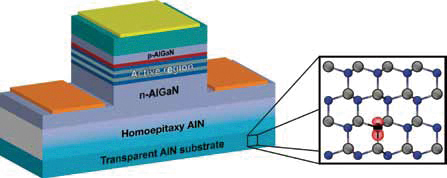 (그림) LED 소자의 효율은 질화알루미늄의 투명층의 탄소 점결함에 의해 제한된다. 보통 질화알루미늄 투명층은 4.7 eV(대략 265nm)의 빛파장을 흡수한다. North Carolina State University 연구진들은 컴퓨터공학적인 방법을 이용하였고 새로운 발견을 하였다.